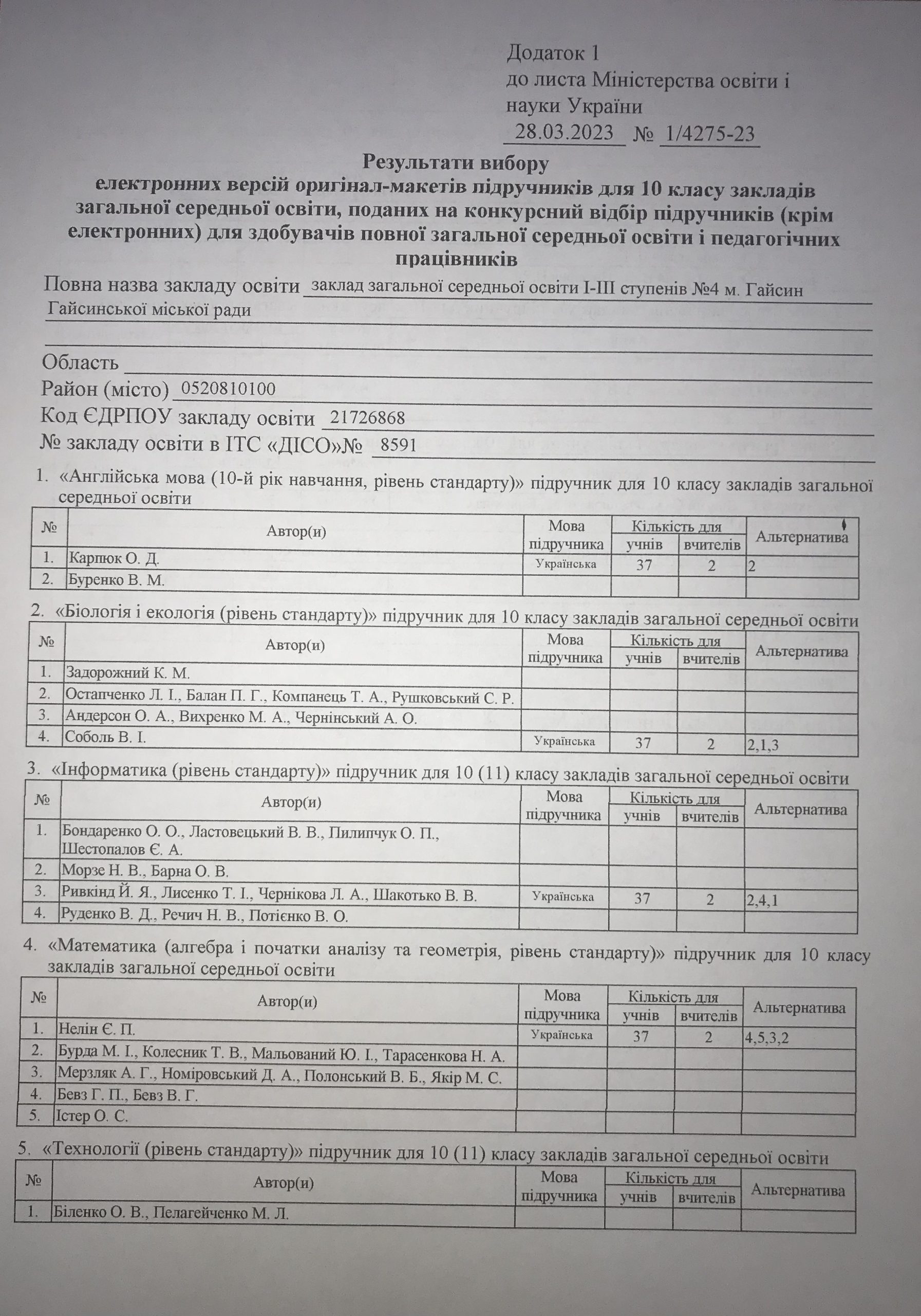 Список здобувачів освіти, зарахованих до 1 класу ЗЗСО І-ІІІ ступенів №4 м. Гайсин Гайсинської міської ради