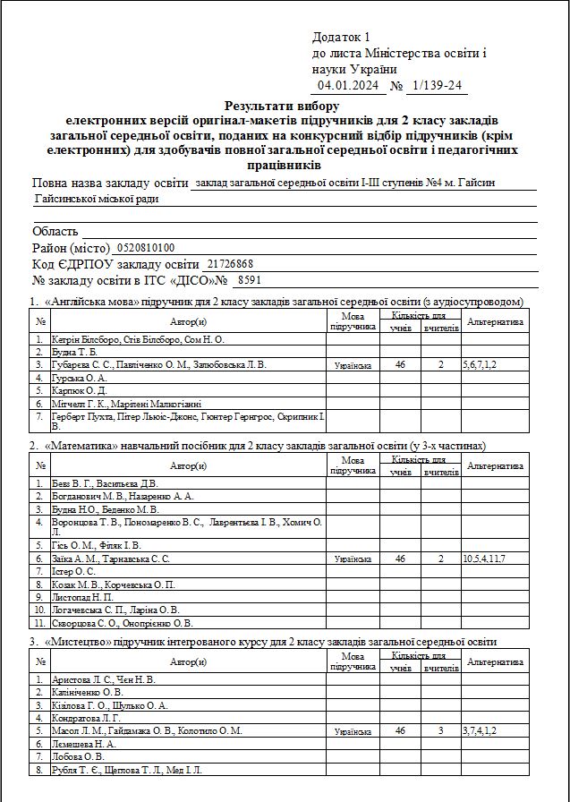 Список здобувачів освіти, зарахованих до 1 класу ЗЗСО І-ІІІ ступенів №4 м. Гайсин Гайсинської міської ради