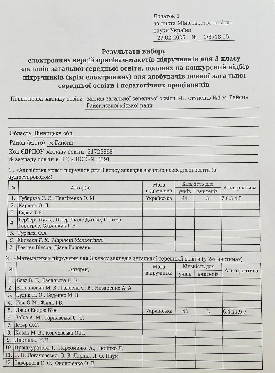 Список здобувачів освіти, зарахованих до 1 класу ЗЗСО І-ІІІ ступенів №4 м. Гайсин Гайсинської міської ради