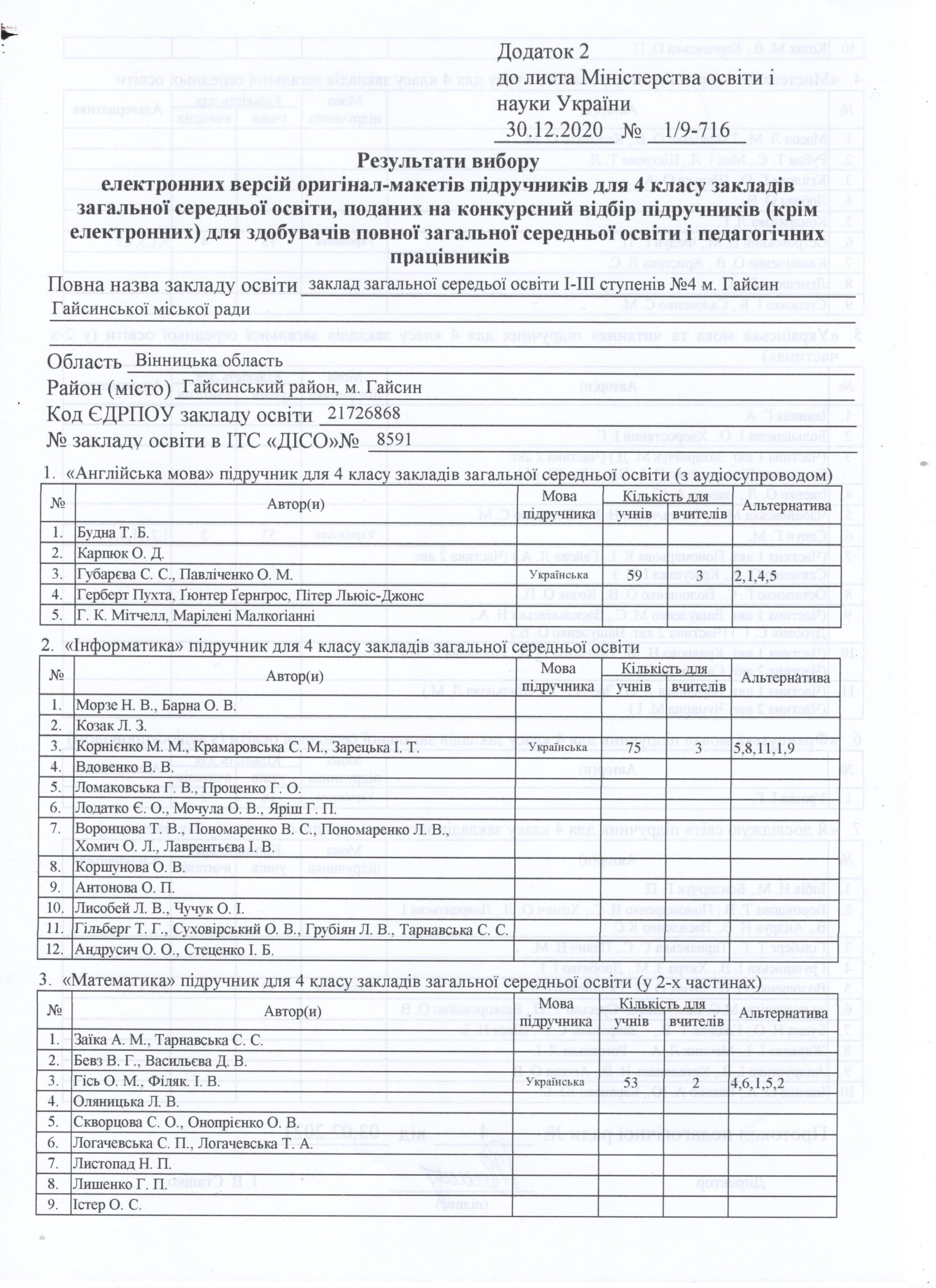 Список здобувачів освіти, зарахованих до 1 класу ЗЗСО І-ІІІ ступенів №4 м. Гайсин Гайсинської міської ради
